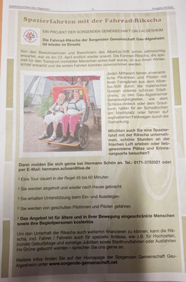 Eine speziell für die Beförderung immobiler Menschen konzipierte Fahrrad- bzw. E-Bike-Rikscha, die mit Hilfe von großzügigen Förderungen der Kreisverwaltung Mainz-Bingen, der VG Gau-Algesheim und der Katholischen Kirche St. Cosmas und Damian angeschafft werden konnte, macht dies nun endlich möglich.